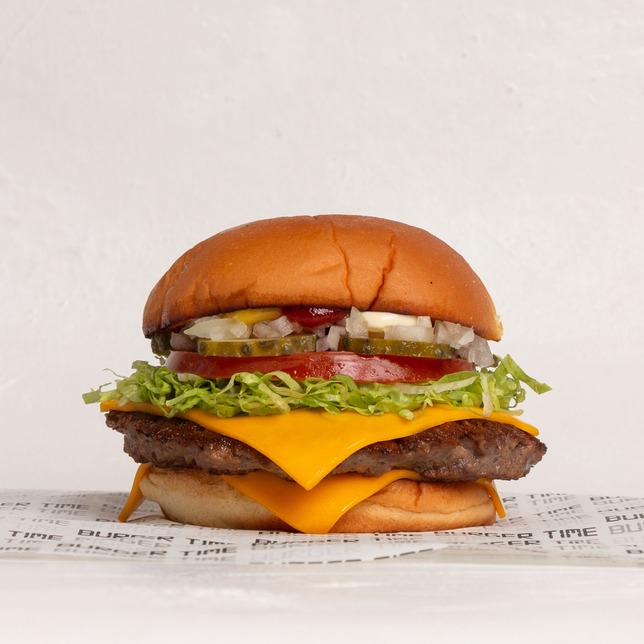 Pan Martin’s, queso cheddar, cebolla picada, lechuga, tomate, pepinillo, mostaza, ketchup y mayonesa